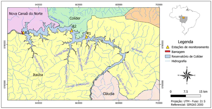 A construção de usinas hidrelétricas é marcada por eventos bastante significativos, dentre eles destacam-se a formação do lago e o enchimento do reservatório. Durante a formação de reservatórios artificiais, podem ocorrer alterações na qualidade da água devido à submersão dos solos e da vegetação, sendo este um dos principais impactos sobre o ecossistema. Nesse contexto, avaliou-se a qualidade da água do rio Teles Pires antes e após a construção de barramento da UHE Colíder. Dados do monitoramento de qualidade de água na região do empreendimento, cedidos pela concessionária responsável, foram avaliados. Visando avaliar possíveis alterações na característica das águas, entre as fases rio, supressão vegetal e reservatório foi utilizado o teste de Kruskal-Wallis e o teste da Menor Diferença Significativa (LSD) com o procedimento de correção de Holm-Bonferroni, para as comparações múltiplas. Das variáveis analisadas, as que apresentaram diferenças entre as fases foram: cálcio total, carbono orgânico total (COT), cloreto total, coliformes termotolerantes, coliformes totais, condutividade, fósforo total, nitrato, nitrito, nitrogênio amoniacal, nitrogênio total, ortofosfatos, oxigênio dissolvido, profundidade do ponto, disco de Secchi, temperatura, turbidez.