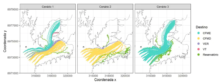 O rio Madeira transporta grande quantidade de troncos, principalmente nos períodos de cheia (estimativa de 30.000 troncos por dia), os quais podem interferir na operação das hidrelétricas em seu curso. Este trabalho apresenta a simulação hidrodinâmica tridimensional do rio Madeira e o transporte desse material lenhoso, para analisar seu comportamento ao longo do rio e ter o conhecimento da sua posição conforme o escoamento. Neste trabalho, os troncos são reproduzidos como partículas pelo modelo PART do Delft3d, simulado através da modelagem Lagrangeana. São apresentados cenários hipotéticos com alguns modos de operação da UHE Jirau e diversas condições de vazões.
